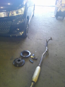 お客様より、車検でお預りをし点検をさせて頂きました所、マフラーの排気漏れ、ブレーキパッドの摩耗、ブレーキ・ディスクのサビによる損傷・摩耗などが確認されましたので交換をさせて頂きました。