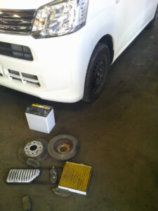 今回は、ダイハツ ムーヴのエアクリーナー・エレメント、エアコンフィルター、バッテリー、フロント・ブレーキパッド、ブレーキ・ディスクの交換をさせて頂きました。