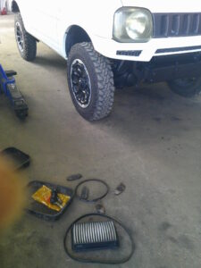 今回は、スズキ ジムニーのエアクリーナー・エレメント、ファンベルト、エアコンベルト、タイロッド・エンド、フロント・ブレーキパッドの交換をさせて頂きました。