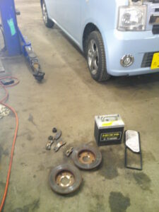 今回は、ダイハツ ムーヴコンテのエアクリーナー・エレメント、バッテリー、フロント・ロアー・アーム・ブーツ、タイロッド・エンド・ブーツ、フロント・ブレーキパッド、ブレーキ・ディスクの交換をさせて頂きました。