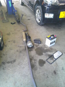 お客様より、車検でお預りをし点検をさせて頂きました所、エアクリーナーの汚れ、バッテリーの劣化、マフラーの排気漏れ、ショック・アブソーバのオイル漏れ、ラック・ブーツの破れ、タイロッド・エンド・ブーツの破れなどが確認されましたので交換をさせて頂きました。