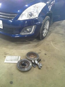 今回は、スズキ スイフトのエアクリーナー・エレメント、左リヤ・ドライブ・シャフト・インナー・ブーツ、フロント・ブレーキパッド、リヤ・ブレーキパッド、ブレーキ・ディスイクの交換をさせて頂きました。