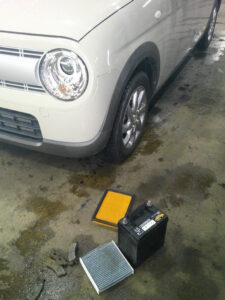 今回は、スズキ アルトラパンのエアクリーナー・エレメント、エアコンフィルター、バッテリー、フロント・ブレーキパッドの交換をさせて頂きました。