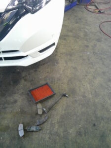 お客様より、車検でお預りをし点検をさせて頂きました所、エアクリーナーの汚れ、スタビ・リンク・ブーツの破れ、ブレーキパッドの摩耗などが確認されましたので交換をさせて頂きました。