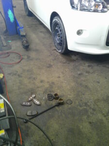 今回は、トヨタ ポルテの左フロント・スタビ・リンク、フロント・ブレーキパッド、キャリパー・シール、ピストンの交換をさせて頂きました。