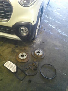 今回は、トヨタ ピクシスジョイのエアクリーナー・エレメント、ファンベルト、エアコンベルト、タイロッド・エンド・ブーツ、フロント・ブレーキパッド、ブレーキ・ディスクの交換をさせて頂きました。