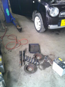今回は、スズキ アルトラパンのバッテリー、フロント・ロアー・アーム・ブーツ、左フロント・コイルスプリング、フロント・メンバー・アーム、フロント・ブレーキパッド、ブレーキ・ディスク、右リヤ・ブレーキ・ホイールシリンダーの交換をさせて頂きました。