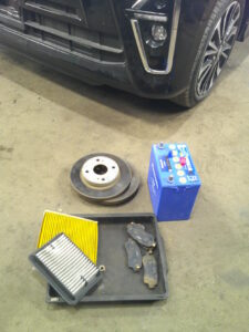 お客様より、車検でお預りをし点検をさせて頂きました所、エアクリーナーの汚れ、エアコンフィルターの汚れ、バッテリーの劣化、ブレーキパッドの摩耗、ブレーキ・ディスクのサビによる摩耗・損傷などが確認されましたので交換をさせて頂きました。