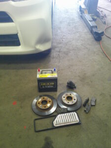お客様より、車検でお預りをし点検をさせて頂きました所、エアクリーナーの汚れ、バッテリーの劣化、シャフト・ブーツの破れ、ブレーキパッドの摩耗、ブレーキ・ディスクのサビによる摩耗・損傷などが確認されましたので交換をさせて頂きました。